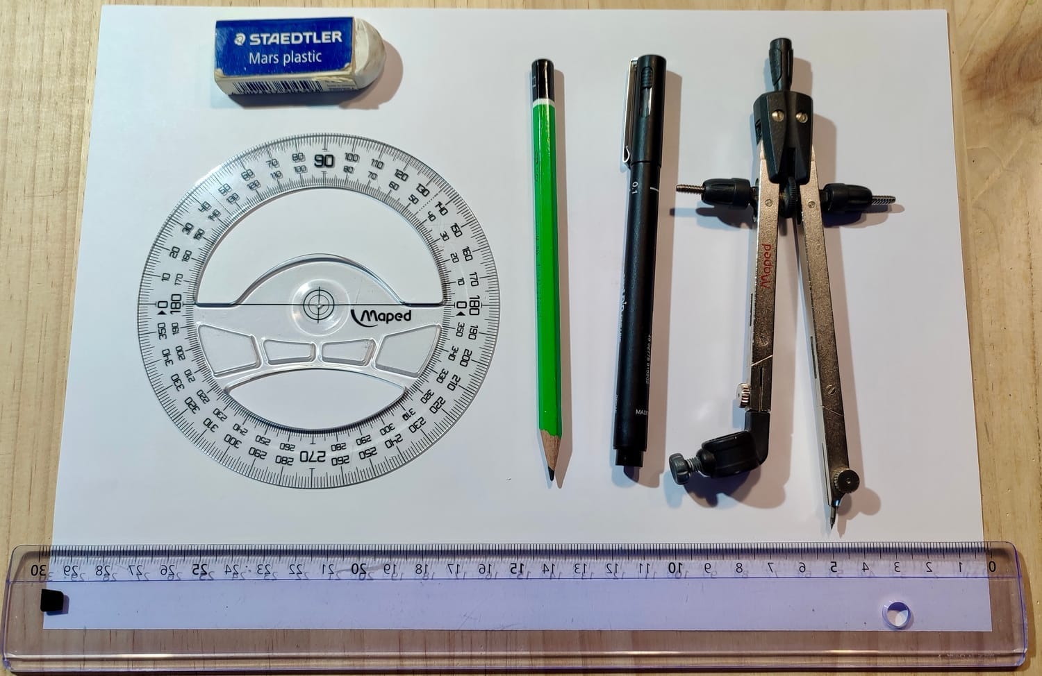 feuille A4, règle, crayon, gomme, compas avec une bague, rapporteur. Un stylo